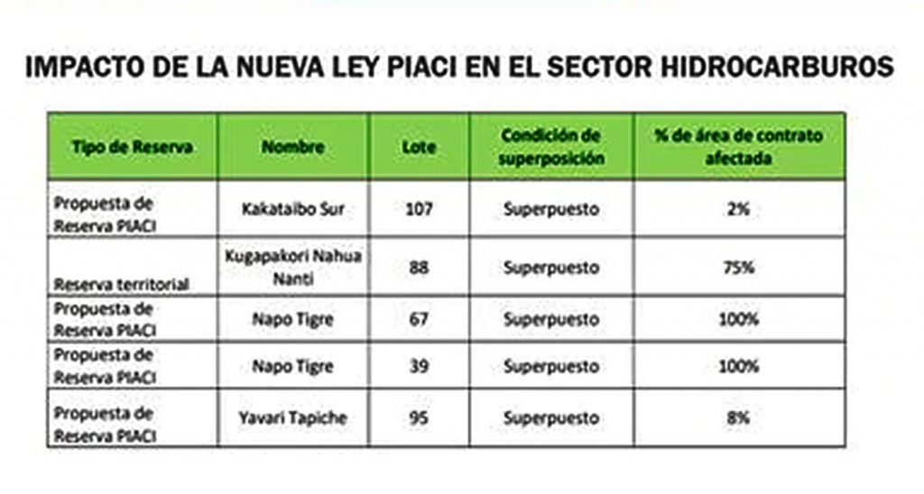 La nueva ley de pueblos indígenas en aislamiento voluntario y contacto inicial afectaría las operaciones de cinco lotes de petróleo y gas.